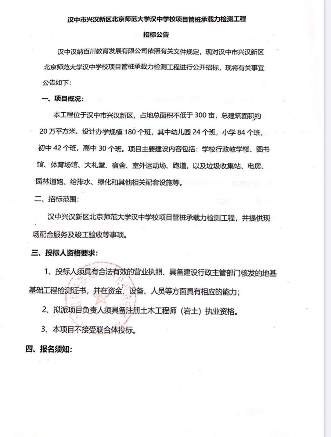 漢中市興漢新區北京師范大學漢中學校項目管樁承載力檢測工程招標公告  漢中漢納百川教育發展有限公司...